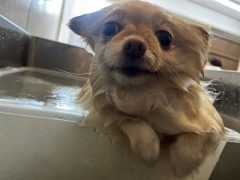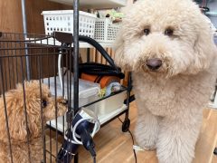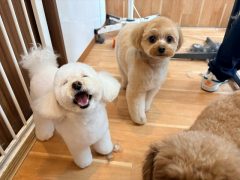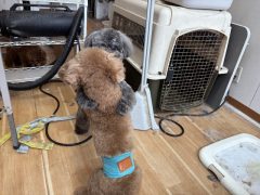 1日2食(ご希望によりご飯の回数変更いたします)、ワンちゃんの相性を見ながら順番でトリミング室内での運動タイム、1日2~3回外に出てのトイレタイムもあります。(天候によってできない場合もあります)