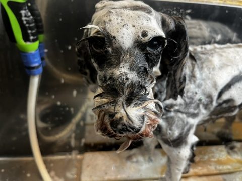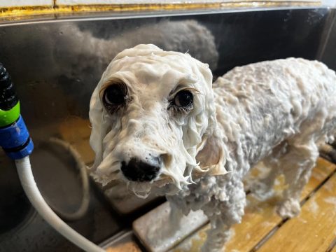 真っ白ヘアーを目指してシャンプーで全身の汚れを丁寧に落としていきます(^ω^)