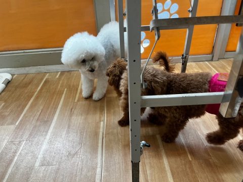 いつもお散歩中にお店に寄っている時はしっぽをフリフリしていますがトリミングの日は少し抵抗🤭🤭