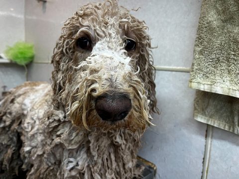 毛が長いのでシャワーヘッドをしっかりと体に押し当てて地肌までしっかりと濡らしていきます🚿