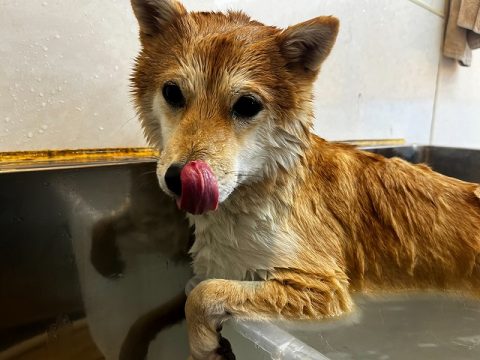 浸かりきらない背中からもかけ流してお散歩でついた汚れをとっていこうね🍃