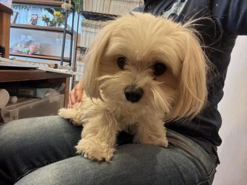 スタッフのお膝の上でくつろいでいるのはモカちゃんです♡