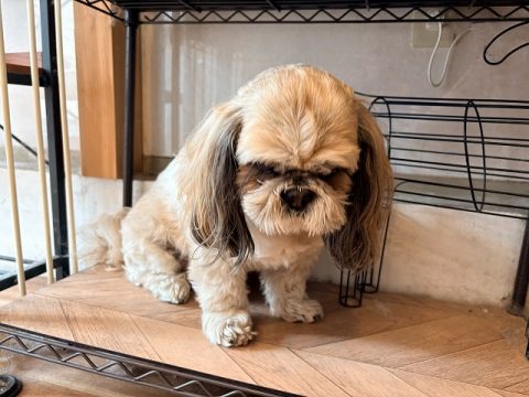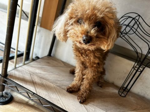 ちょこんとおすわりをして順番を待っているあずきちゃん🩷