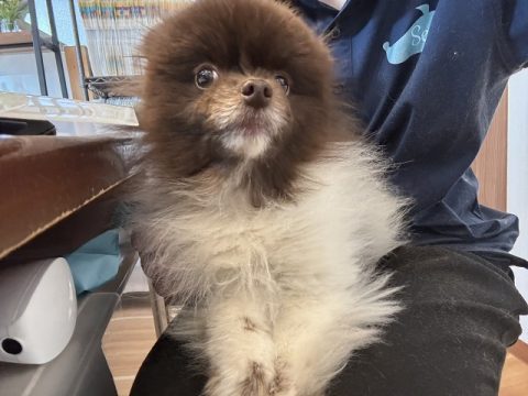 抱っこで写真タイムのモコくんはトリミングコースでご来店です🐧