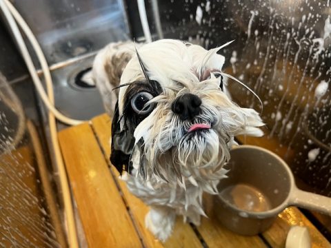 シャンプー中もお友達が気になるぷうくん🛁