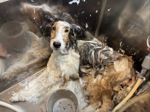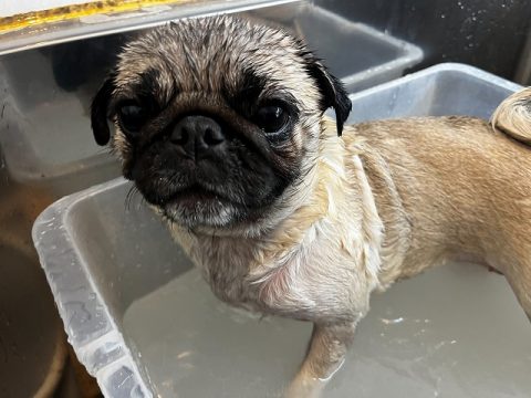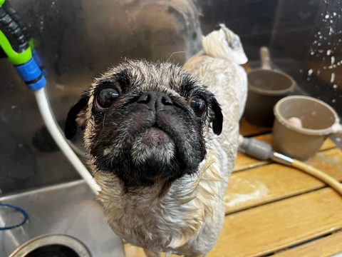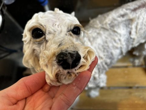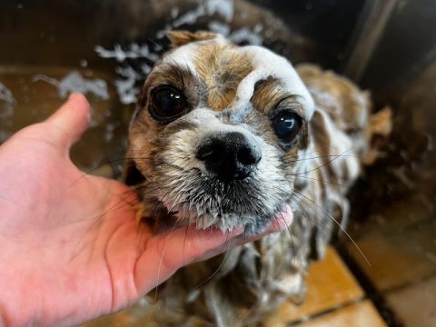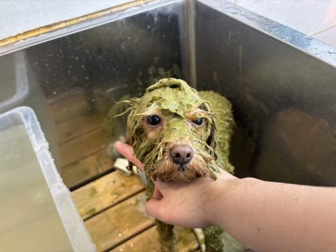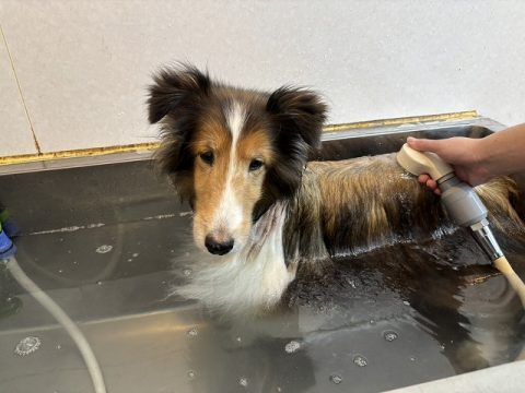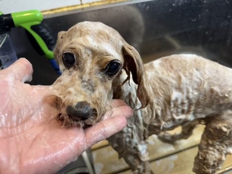 被毛がつやつやになったらパックを洗い流してシャンプーををしていきます🐳