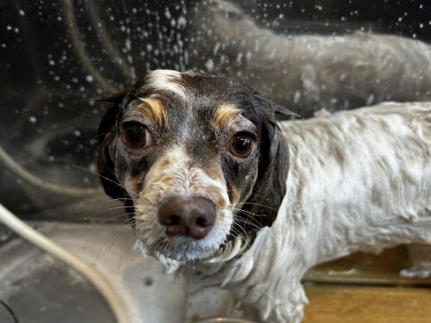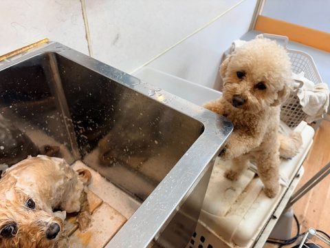 シャンプー中もお友達が気になる様子🐶👀