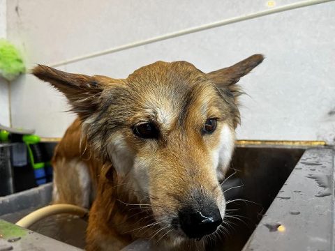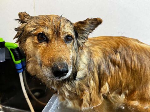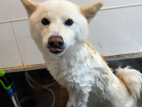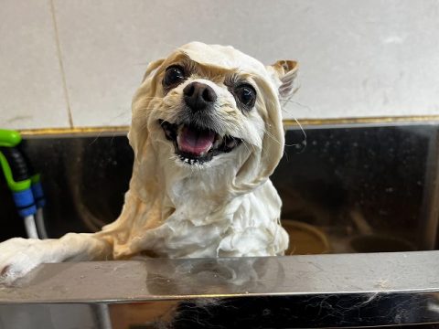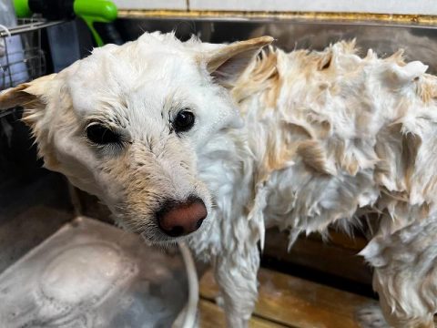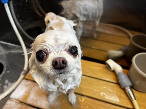 次は、真っ白ヘアーを目指して足先からお顔まで丁寧に汚れを落としていきます🚿