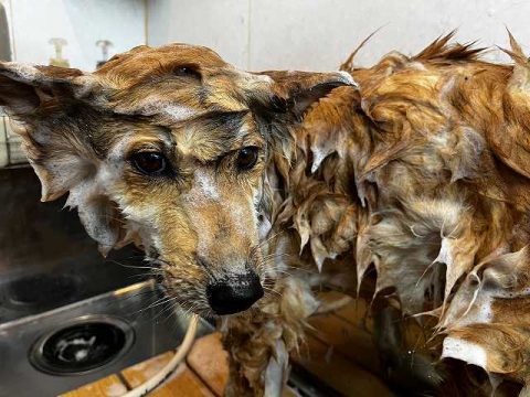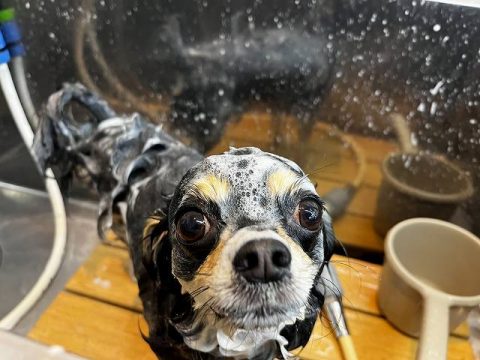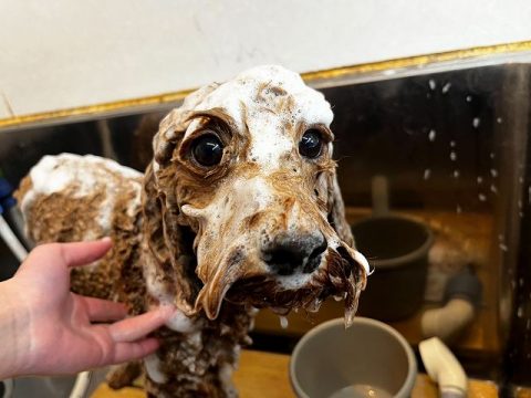 もこもこ泡のシャンプーで全身の汚れを綺麗に落としていきます🛁