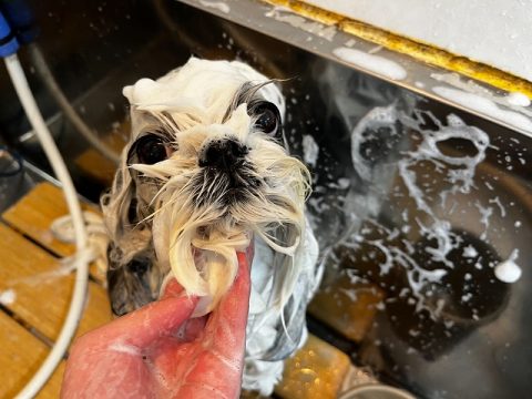 汚れやすいお口や足先まで念入りにシャンプーしていくよ!