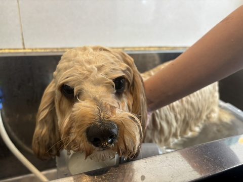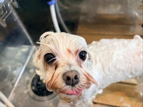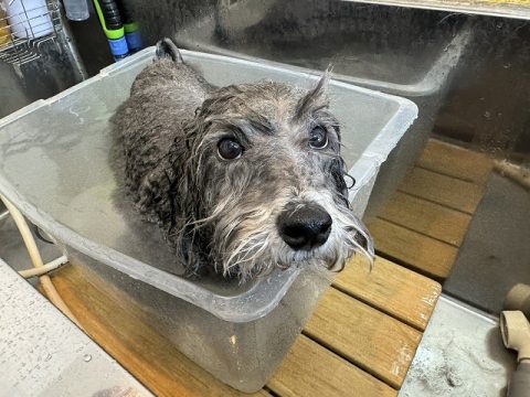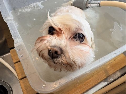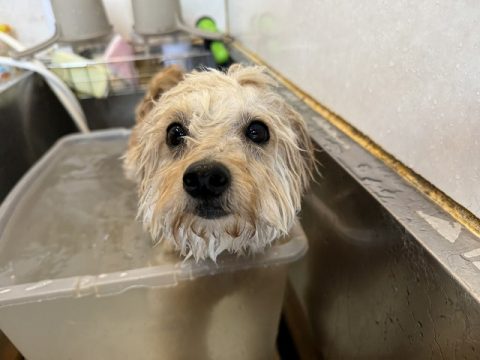 シャンプー中もお友達が気になるむぎちゃん👀終わったら沢山遊ぼうね🎶