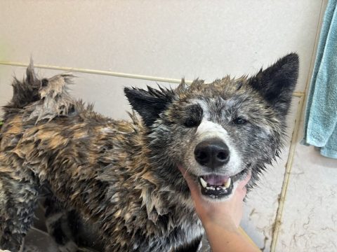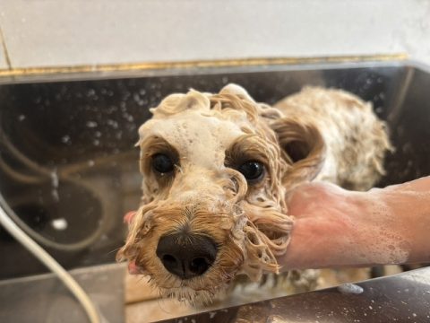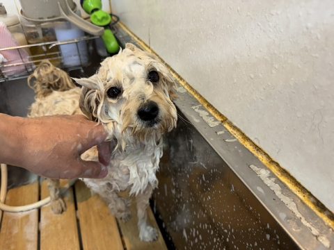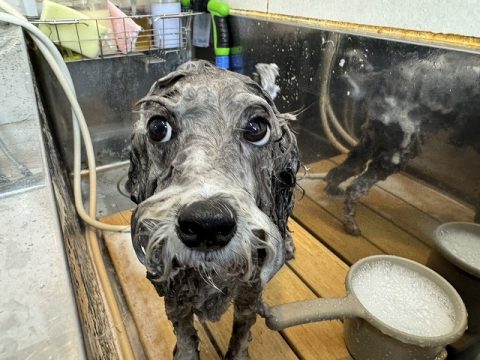 体もバリカンをかけてスッキリできたらシャンプーで汚れや毛を洗い流して行くよ🚿