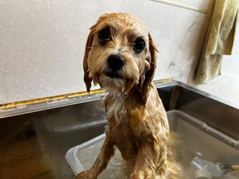 シャンプーも慣れっこ!と言いたいところですがお顔のシャンプーはやっぱり少し苦手なマロンさん🌰