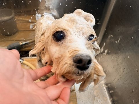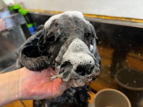 もこもこ泡のシャンプーで全身の汚れを綺麗に落としていきます。