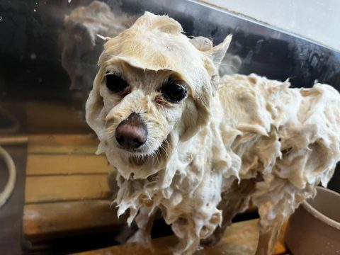 ながーい毛の下の皮膚までしっかりとオゾンを浸透させたらシャンプーの泡で優しく洗っていくよ🫧🪼