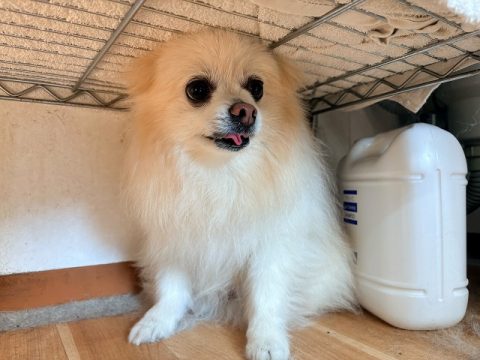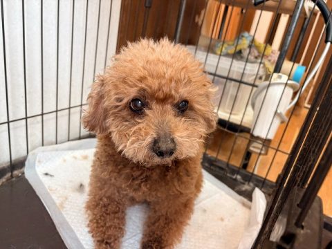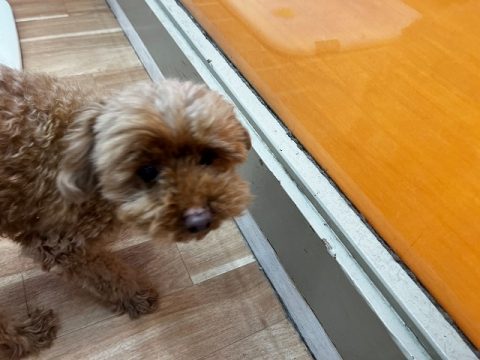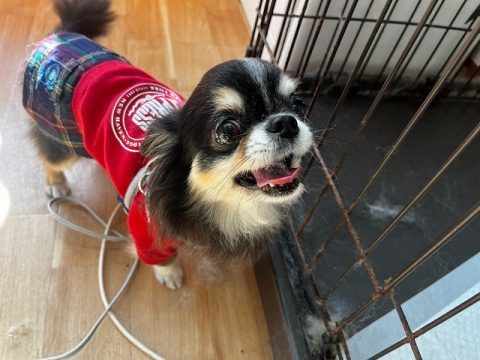 ちょこんとおすわりをして順番を待っているあずきちゃん🩷