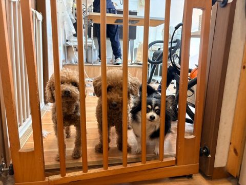並んで飼い主さんをお見送り中のわーくんとりんくん🐶🐶
