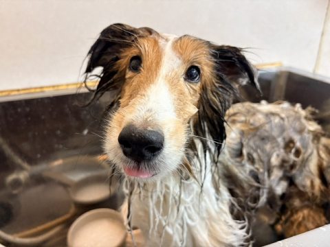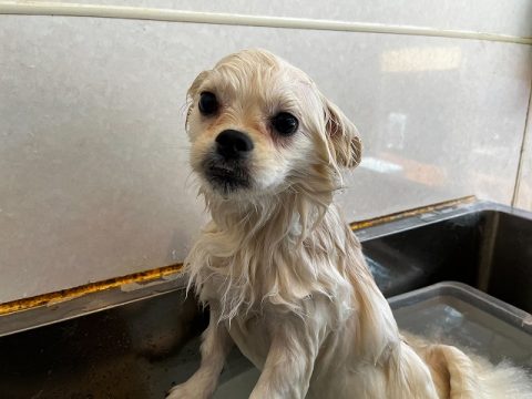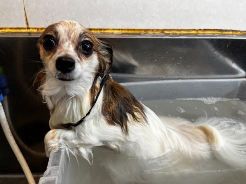 まずは、お風呂から入って雨で汚れたところをシャンプーで綺麗にしていこうね( ◠‿◠ )