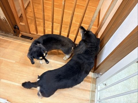 いつもの場所でくっついて順番待ち🐶🐶