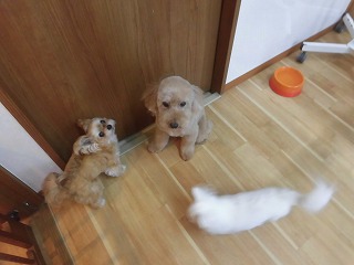 トリミング後はお友達に追いかけられて物陰に隠れちゃったね(*’ω’*)