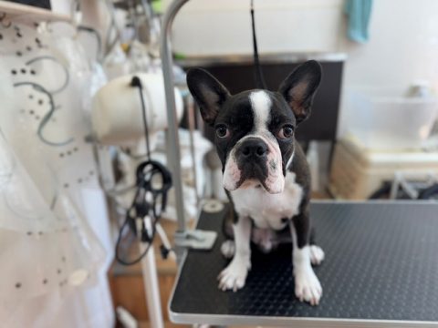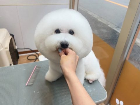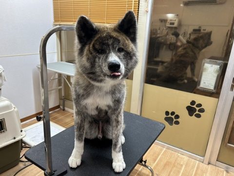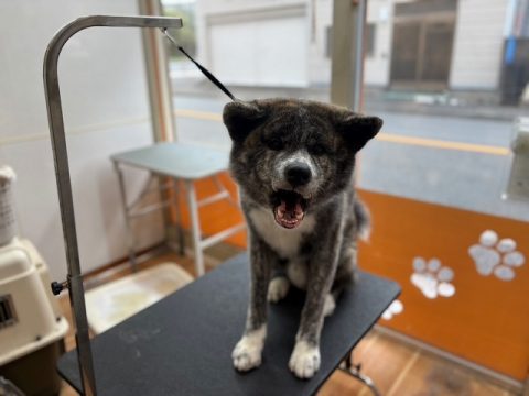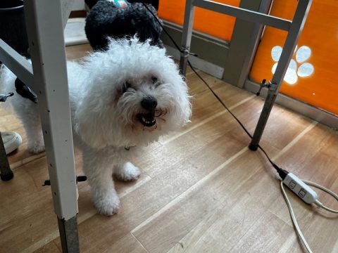 お店に入ってお母さんをお見送りしたら台の上に乗ってトリミングモード開始🔘