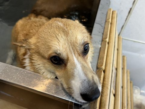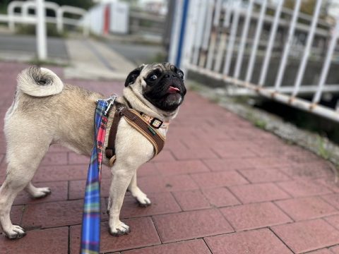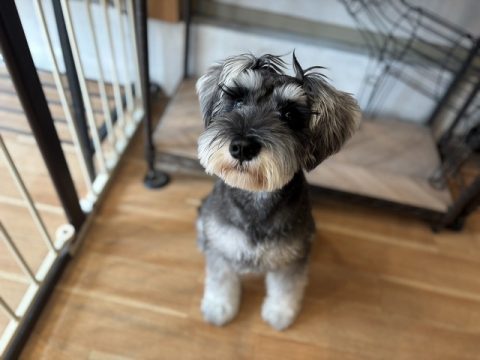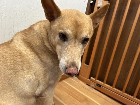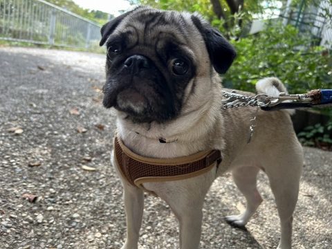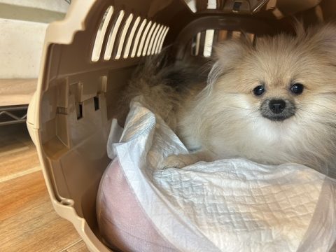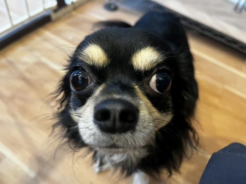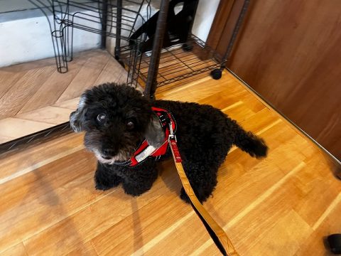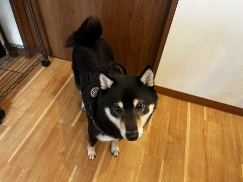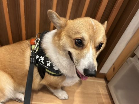 見慣れない場所で緊張した表情のこむぎちゃん🐕
