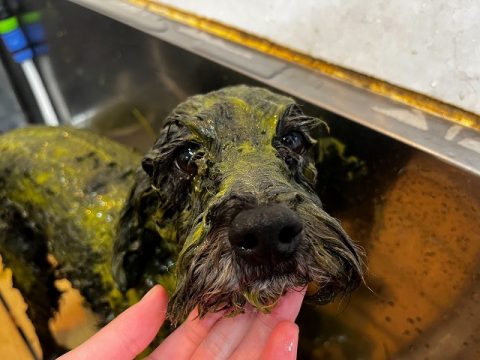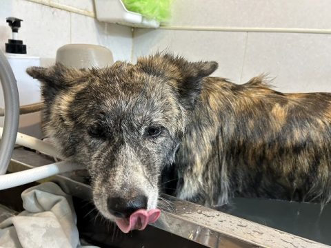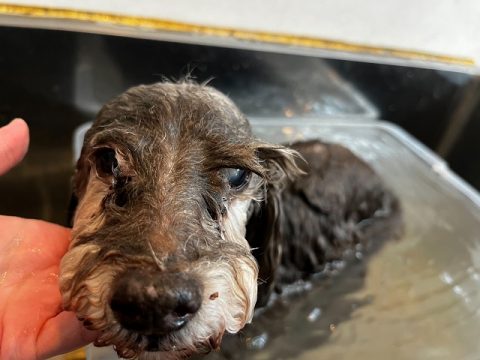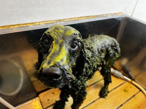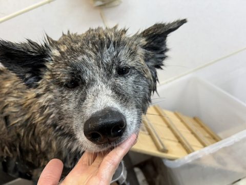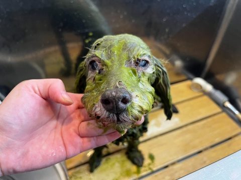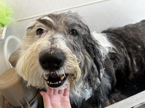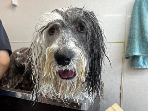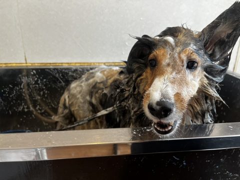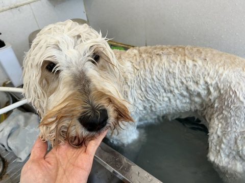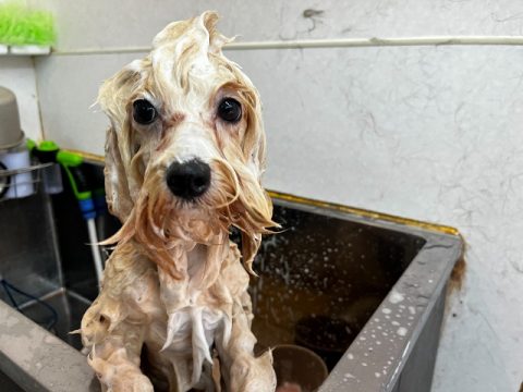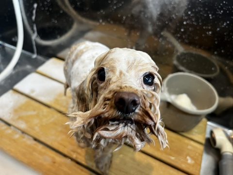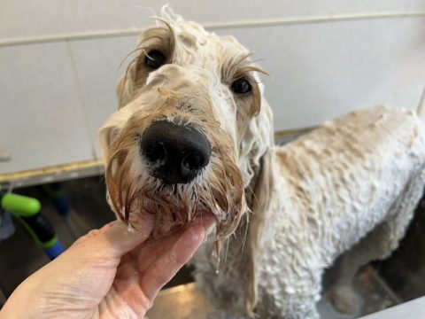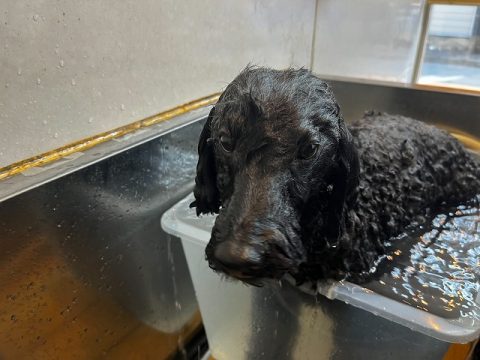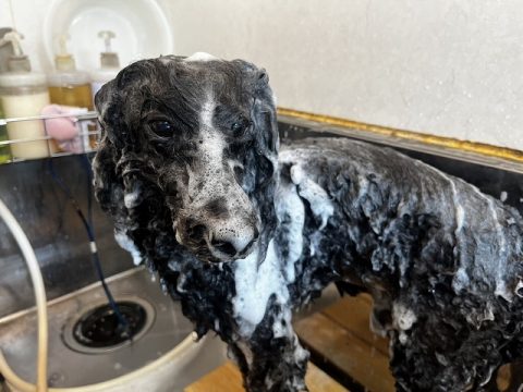 長い被毛の下の地肌までしっかりと濡らせることができたらシャンプーをしていくよ🧼