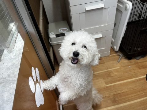 お迎えにすぐ気が付けるようにいつも扉の前で待機するラテくん、スタッフが手を近づけると控えめに甘えてくれます💙