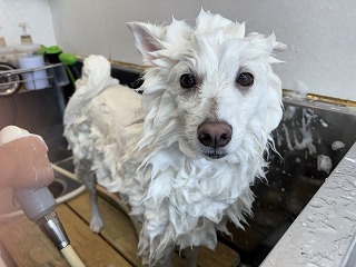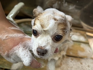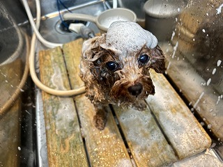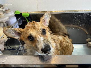 お散歩で汚れてしまったお腹の下や足先は何度か洗ってピカピカにしていきます🧼🫧