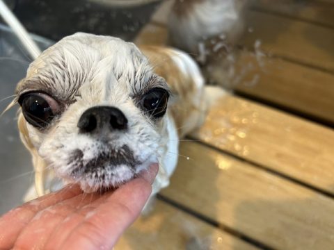 チャームポイントのおひげや眉毛も丁寧にふわふわになるように洗っていきます☁