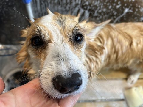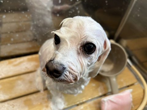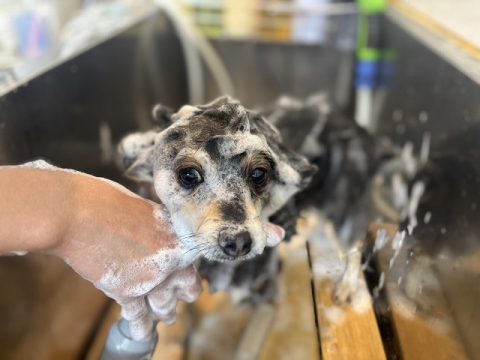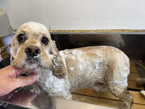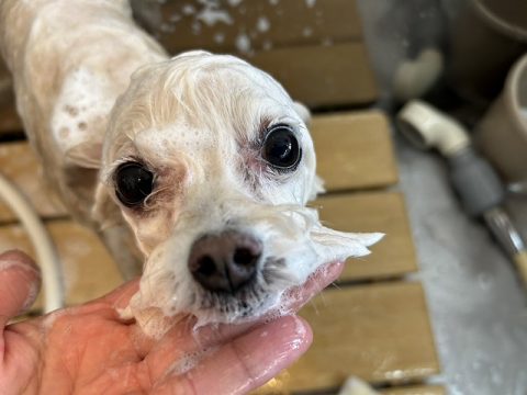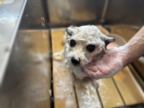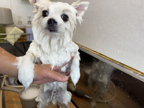 次はもこもこ泡のシャンプーで優しくマッサージしながら汚れを落としていきます(⌒▽⌒)
