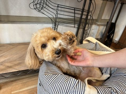 足先のバリカンをかけているポコくん、お家でのお手入れもらくちんだね!♪