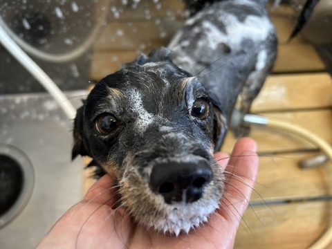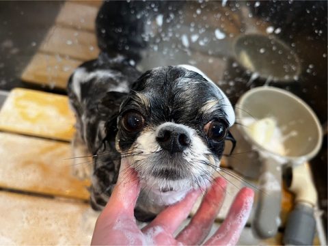 たくさん泡立ててシャンプーをして気持ちよさそうにしているね( *´艸`)